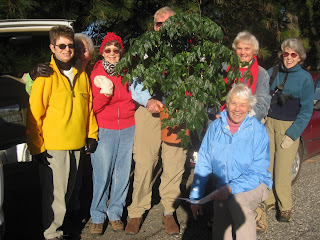 Ready to ignore Christmas as it was bearing down upon us, eight hikers decided to take advantage of an unusually sunny day and stretch our legs. Seven miles of stretch. Priscilla, Maureen, Barbara G., Tiana, Jo, Karen, John, and Elly decided the sunniest non-blacktop hike would probably be Rice's Crossing. Some local residents met us at a road intersection, one expressing surprise at our intended destination. He thinks old ladies and one old man can't hike? After Maureen collected her usual dog names (Bodie and Kiara), we hiked down to the Yuba, noting the unusual prints in the mud. Did a horse carefully complete his horse shoe arc by turning the other way? We still don't know what we were looking at...a peg leg horse? Any horse or cattle experts out there? Not content with the hike's length, we continued up the dirt road from Rice's Crossing to explore and find a sunny spot to eat lunch. We ended up on some rocks and logs above the river between it and the road, soaking up the sun and quiet of the woodland.